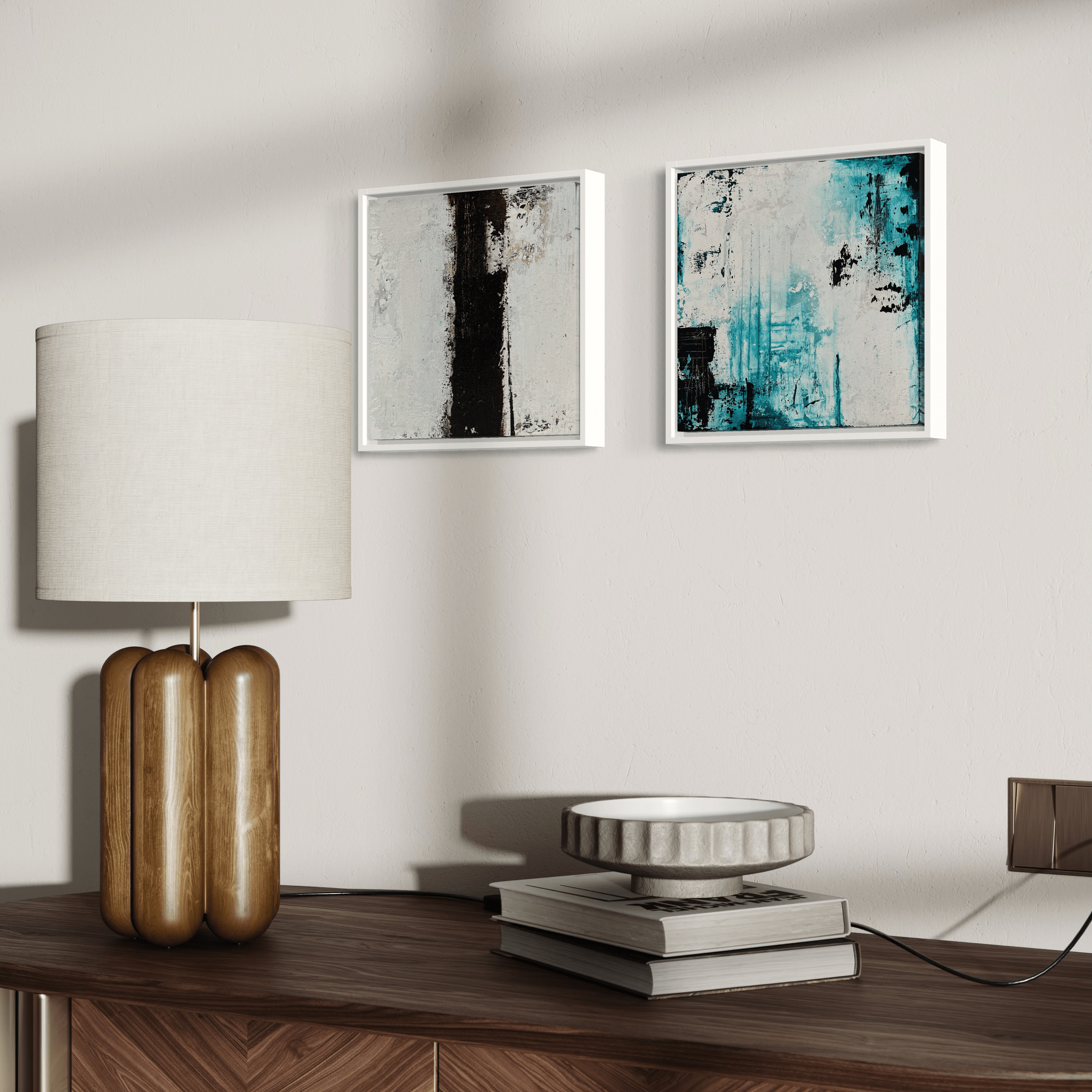 Soft turquoise washes drift into white, interrupted by faint vertical seams and gestures. The composition breathes; it feels like air moving through worn architecture. Texture becomes atmosphere here—less structure, more sensation—capturing the fleeting nature of perception itself.