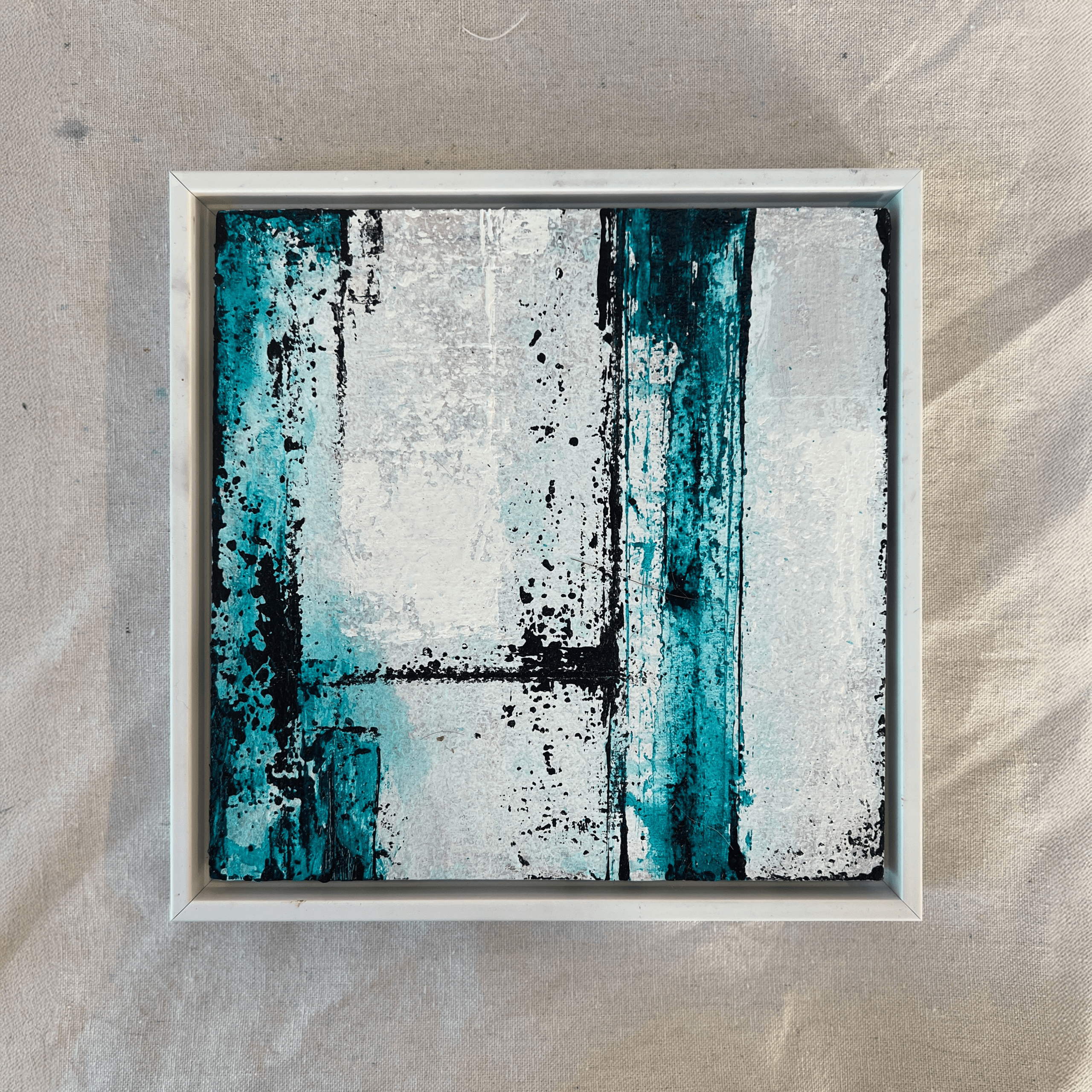 Structured yet eroded, Horizon III explores balance between geometry and emotion. The intersecting black lines recall scaffolding or window frames, while layered blues and greys soften their rigidity. It’s a quiet meditation on boundaries—how form contains and sometimes conceals feeling.